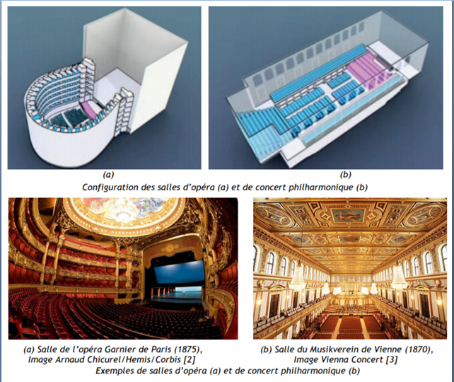 Les meilleures géométries sont celles se rapprochant le plus de cet idéal, la salle plane et en forme de rectangle beaucoup plus long que large n'est pas une bonne solution. Toutes les salles anciennes respectent ce principe, alors pourquoi pas toutes les nouvelles ?